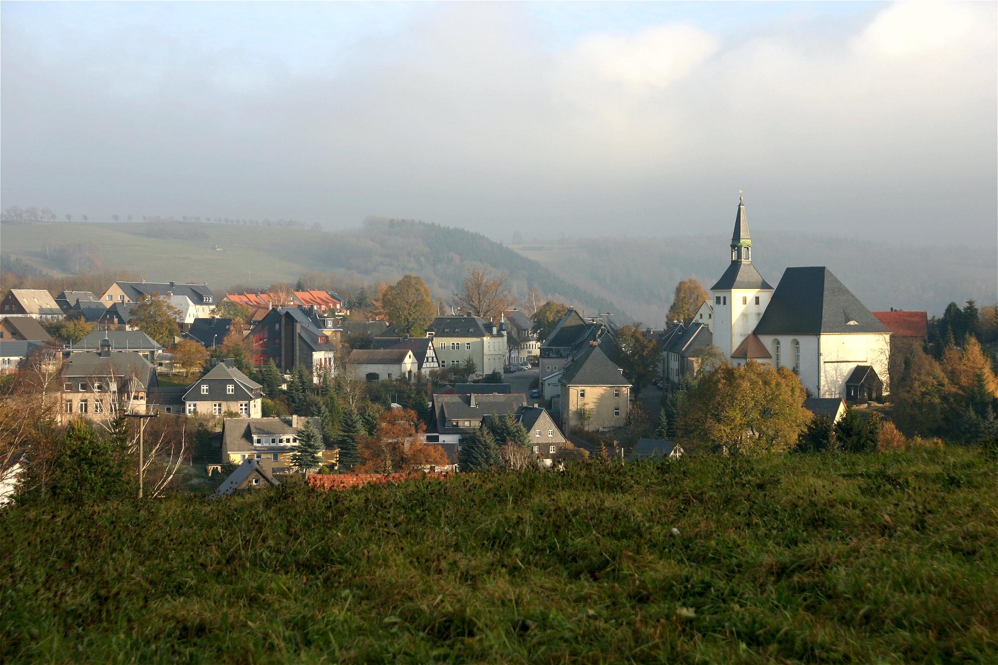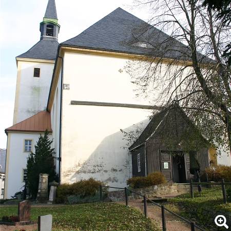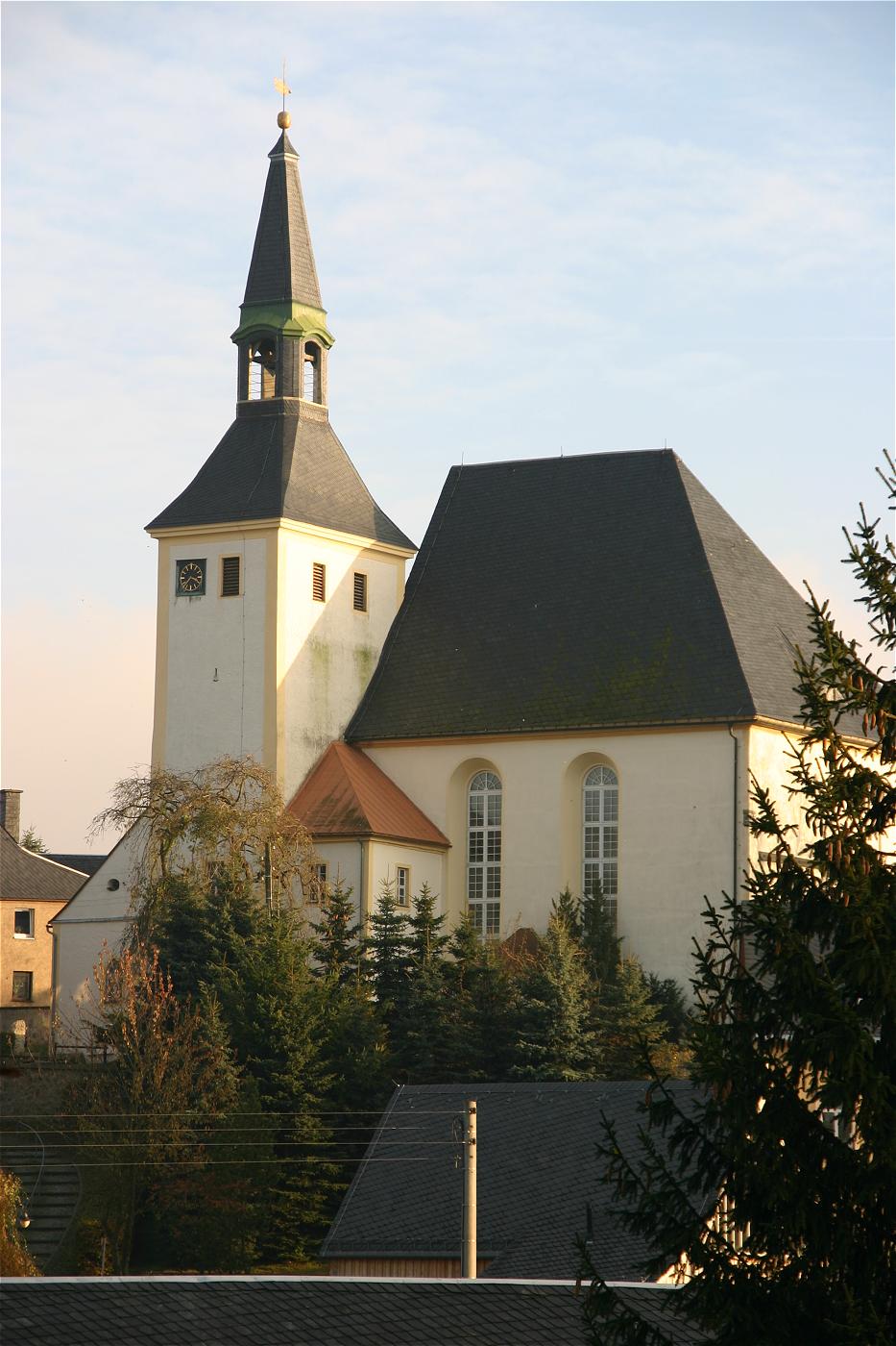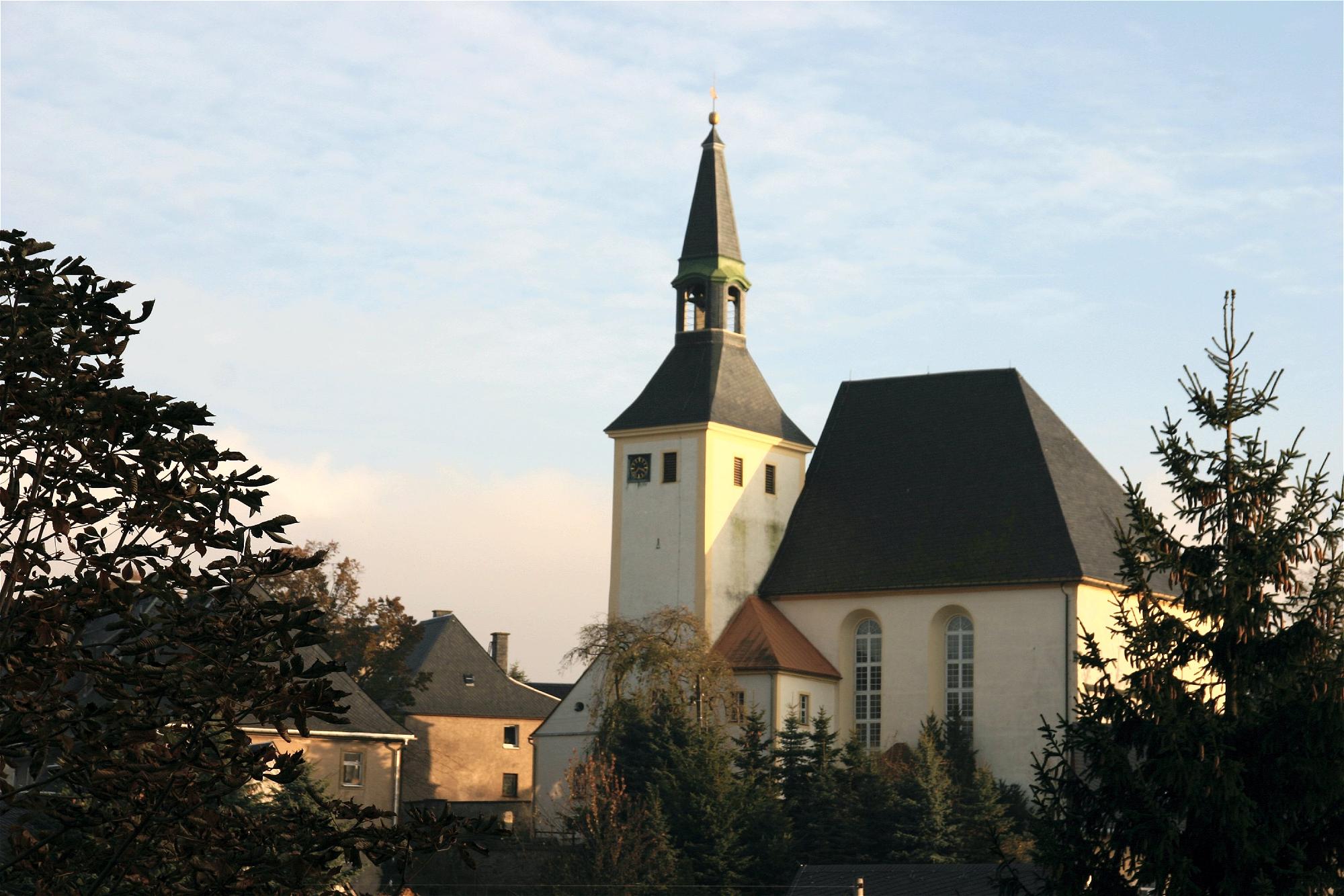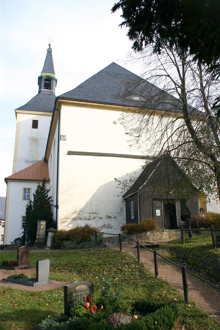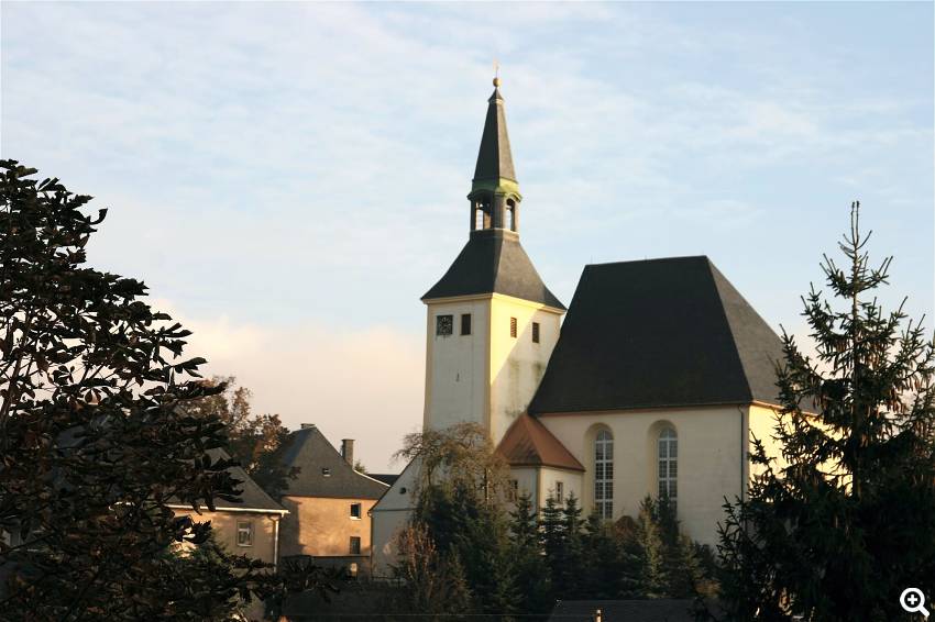 Die Gemeinde war mit der zwischen 1501 und 1506 gegründeten Stadt größer geworden. Das mächtige Schiff ist mit einer Holzdecke versehen. Die umlaufende Empore reicht beidseitig bis an den Triumpfbogen zum Chor. Darüber ist im Westteil die Orgelempore angeordnet. An der Nordseite des Chores ist der mit einem Obelisk-artigen Abschluß versehene Turm angesetzt. In dessen Erdgeschoß die Sakristei mit eingemauerten Resten eines wertvollen Epitaphs aus der Freiberger Lorenzwerkstatt um 1580.