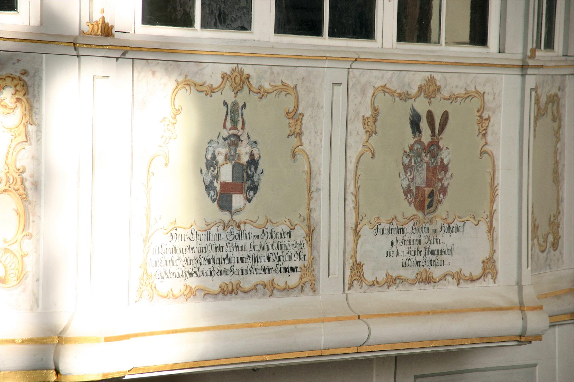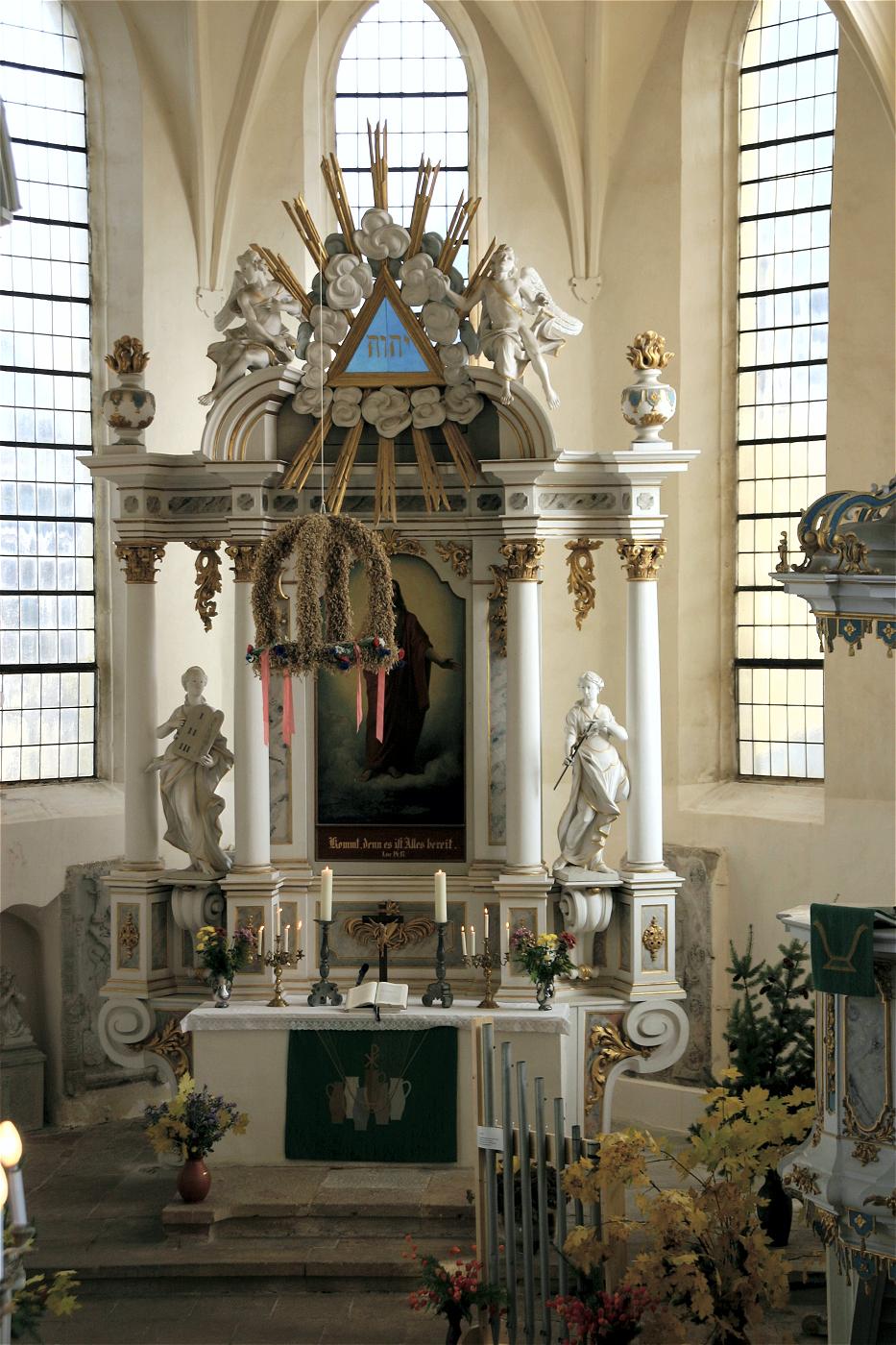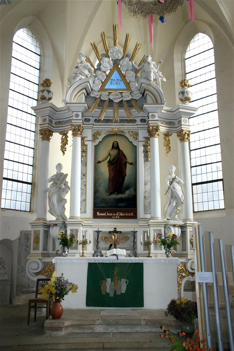 Der barocke Altar, Kanzel, Taufstein und Orgelprospekt stammen aus der Zeit der Erneuerung von 1740. Das Orgelprospekt stammt auch aus dieser Zeit. Das Innenleben ist von Orgelbaumeister Kohl aus Bautzen. Ein prachtvoller Leuchter aus handgeschliffenem böhmischen Kristallglas ist in der Kirchenmitte zu sehen. Im Chorpolygon (hinter dem Altar) befinden sich drei Bildnisgrabsteine der Ritter von Bärnstein und eine Renomierfigur des Hans Heinrich von Schönberg (Schloßherr). Ebenso ist eine Gedenktafel für den Wiederaufbau der Kirche von Holzendorf zu sehen.
