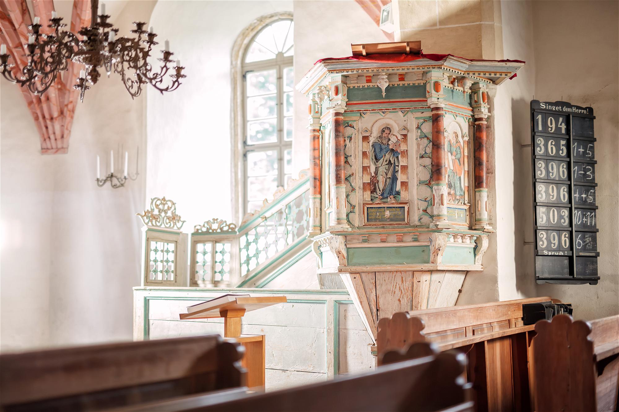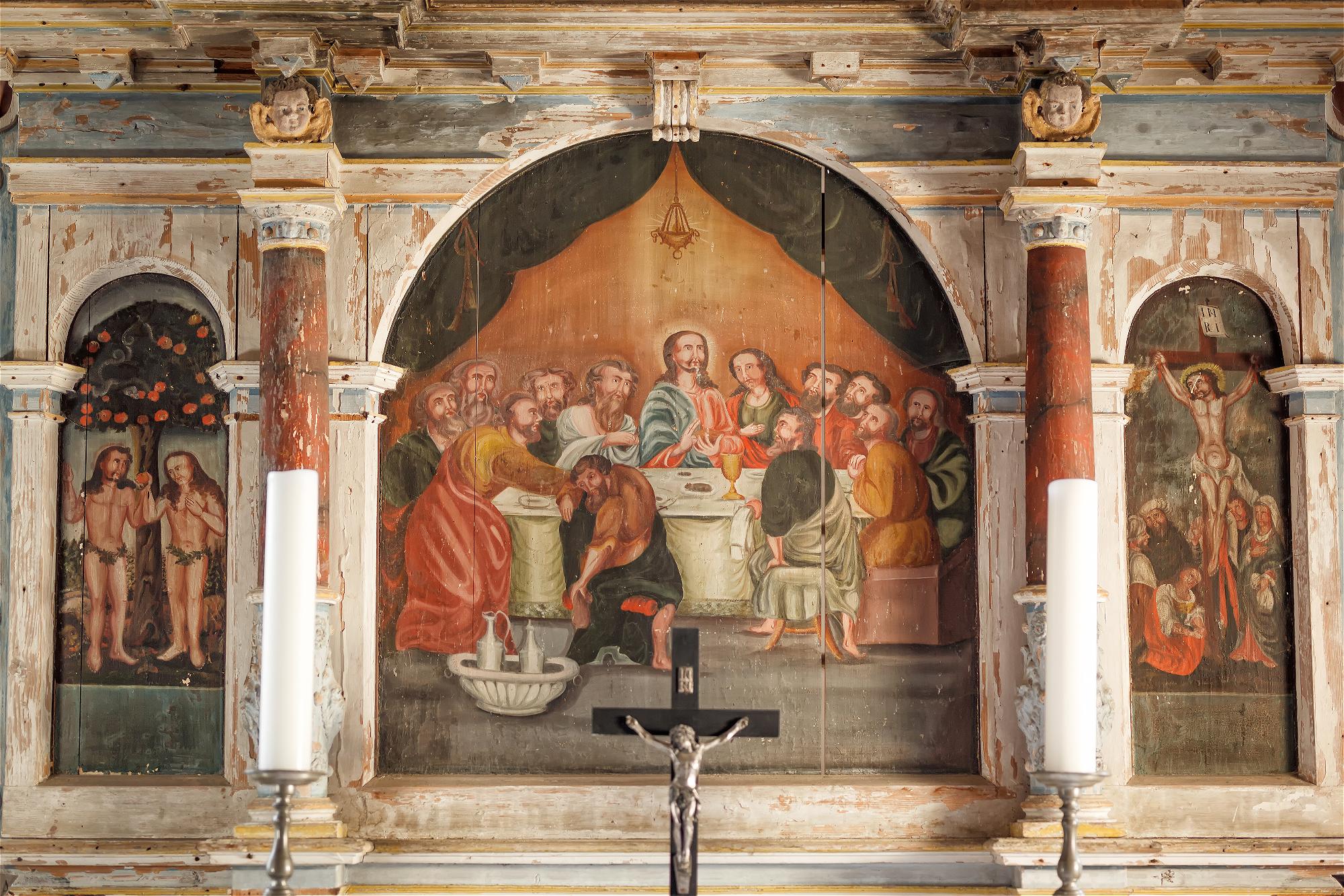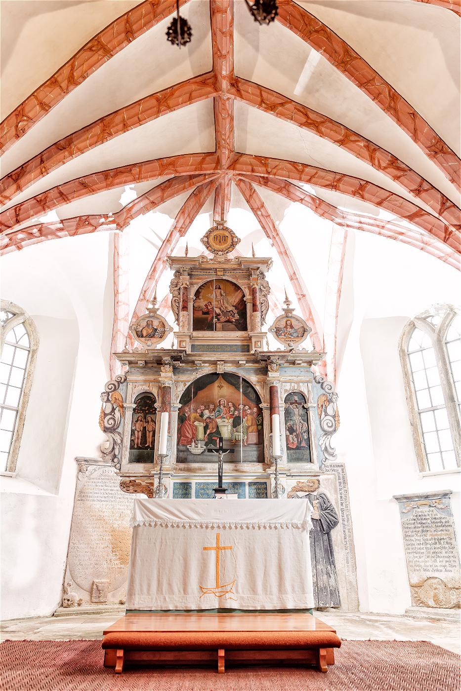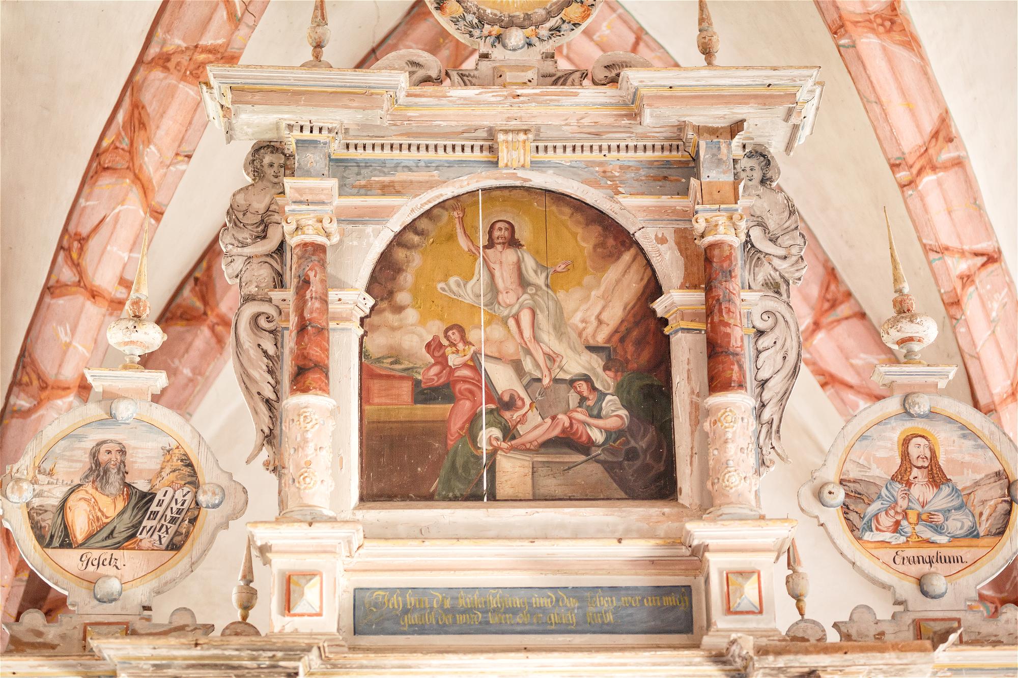 Im Innenraum ist die Holzdecke mit floralen Motiven sowie der farbenfroh bemalte Holzaltar und der neue Sandstein-Taufstein zu erwähnen.