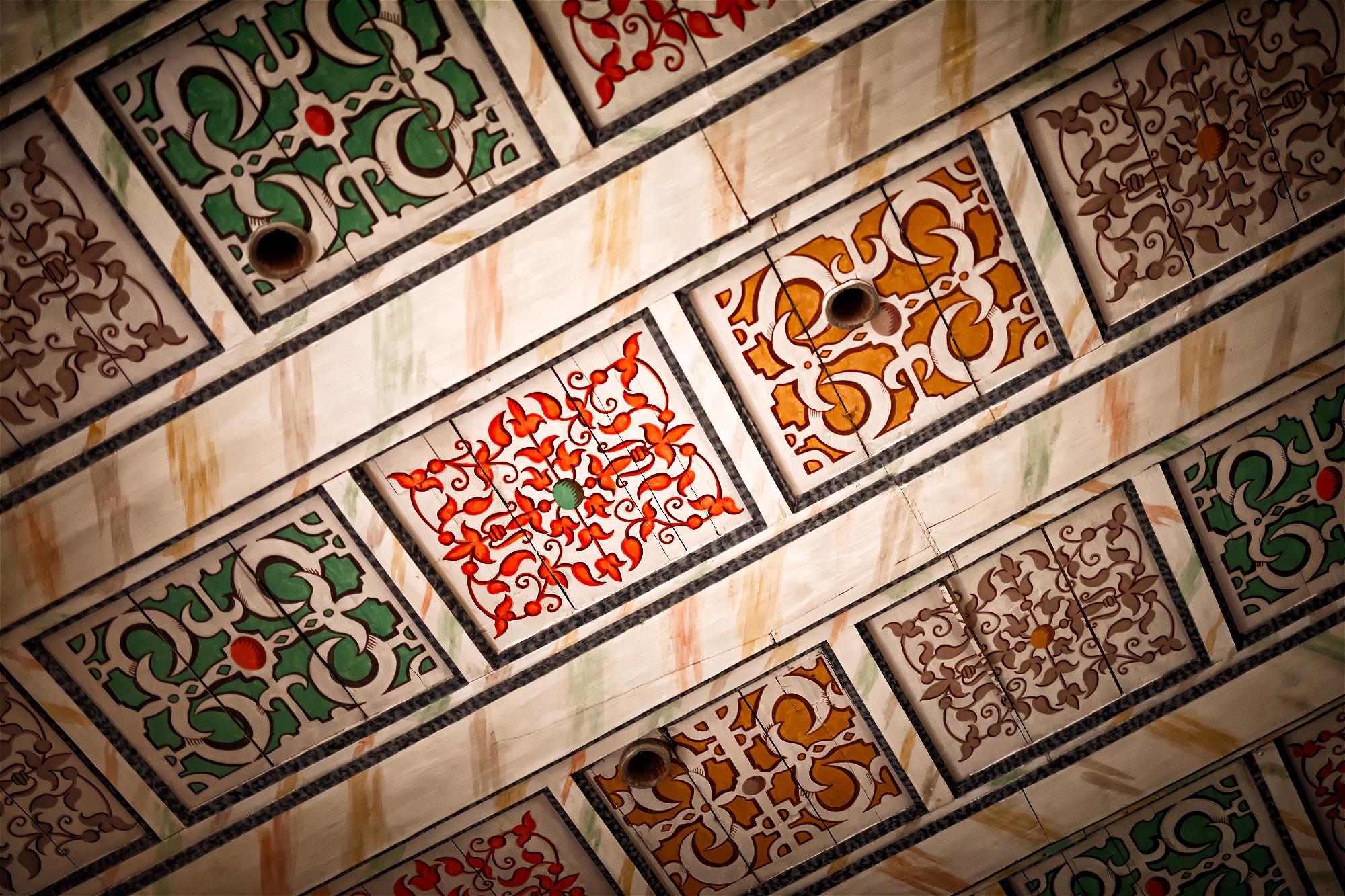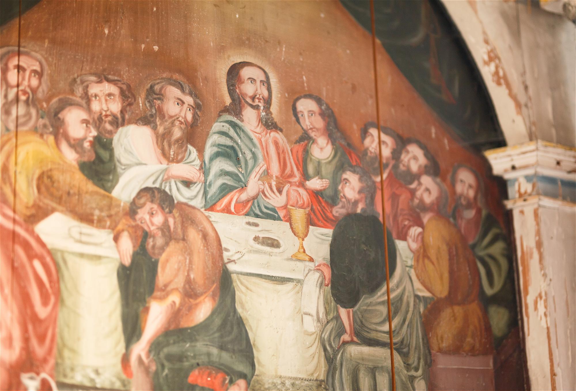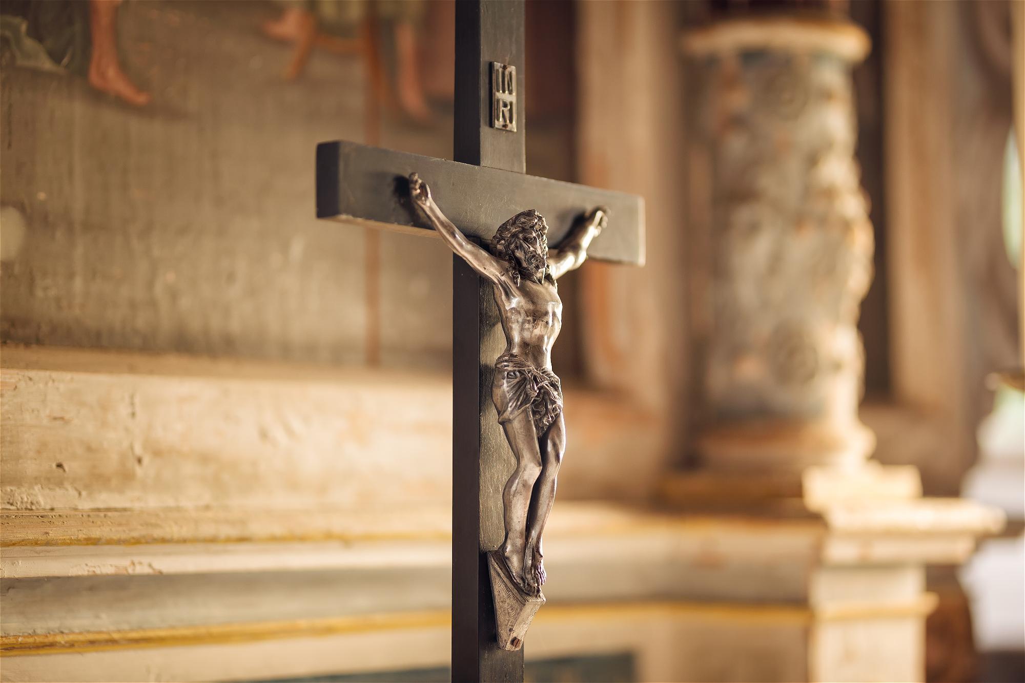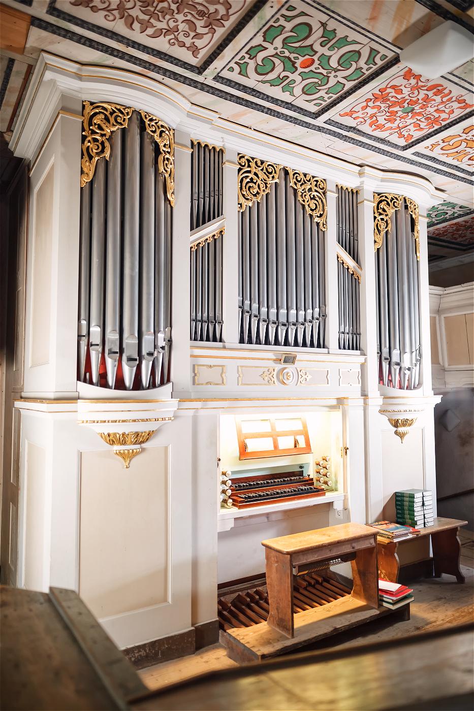 Im Innenraum ist die Holzdecke mit floralen Motiven sowie der farbenfroh bemalte Holzaltar und der neue Sandstein-Taufstein zu erwähnen.