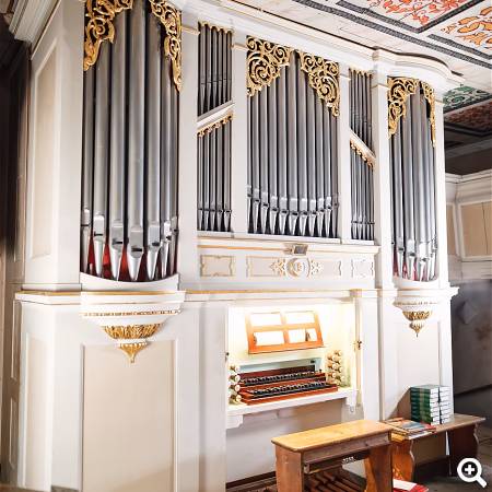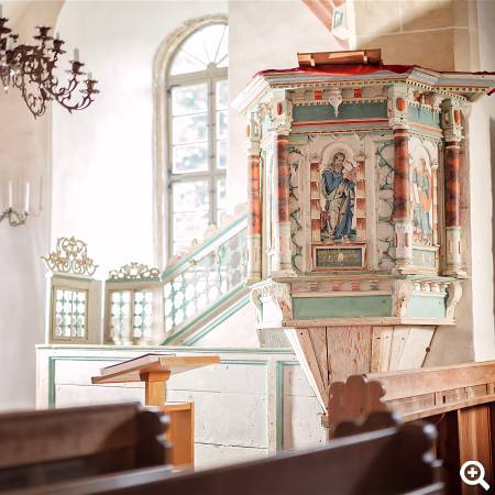 Im Innenraum ist die Holzdecke mit floralen Motiven sowie der farbenfroh bemalte Holzaltar und der neue Sandstein-Taufstein zu erwähnen.