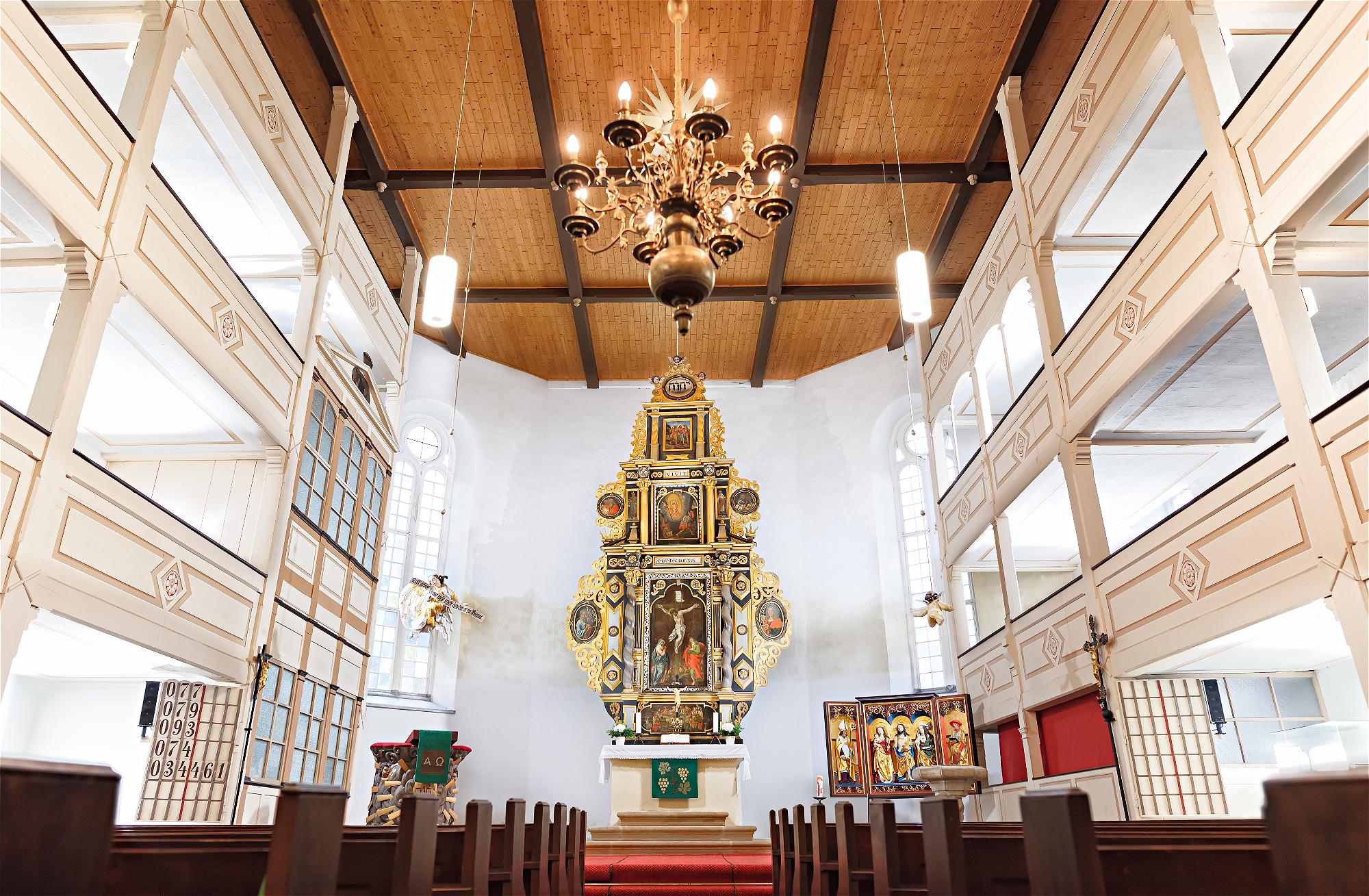 Schon seit dem 15. Jahrhundert befindet sich am Ort der Geisinger Kirche eine Pfarrkirche. 1689 wurde sie als barocke, schlichte Hallenkirche mit dreistöckigen Emporen neu erbaut. Die Ranfft-Orgel stammt von 1757. Besonderheiten sind der barocke Altar und der danebenstehende gotische Flügelaltar aus der Vorgängerkirche von ca. 1530. Über dem Taufstein befinden sich die „Wetterengel“.