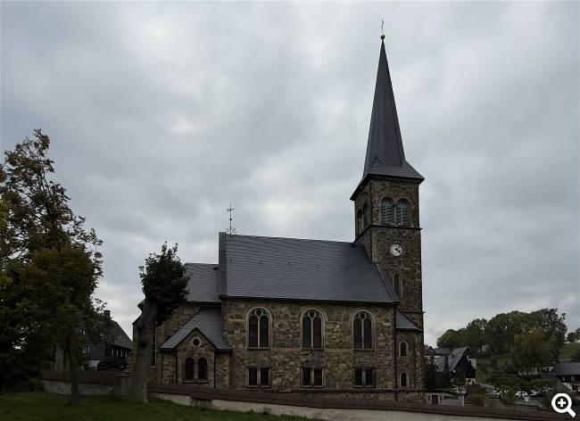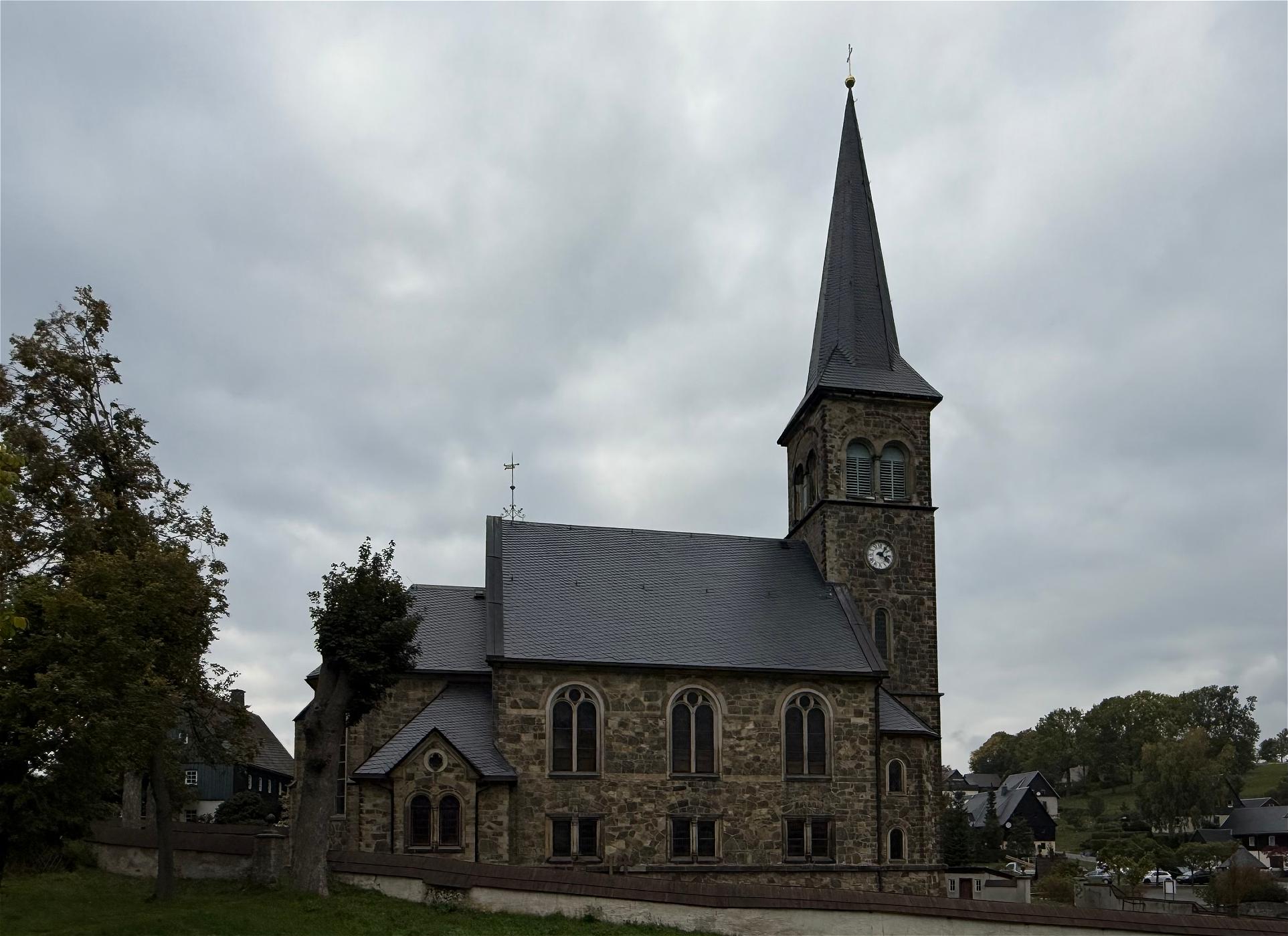 Der Bau der heutigen Kirche wurde 1890 am Standort einer erzgebirgischen Wehrkirche vollendet. Der 47 m hohe Turm mit spitzer, schiefergedeckter Turmhaube ist im Osten ausgerichtet, wobei er dem Dorf zugewandt ist. Obwohl sich die Kirche in der Ortsmitte talwärts befindet, stellt sie einen markanten und harmonisch in die Umgebung eingepassten Orientierungspunkt dar. Das äußere Bild wird durch unverputztes Natursteinmauerwerk mit Schmuckelementen des Historismus geprägt, wobei die unteren Fenster neoromanisch und die oberen mit Maßwerk verziert sind.