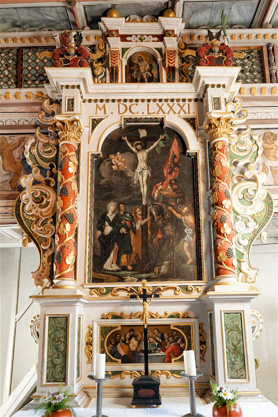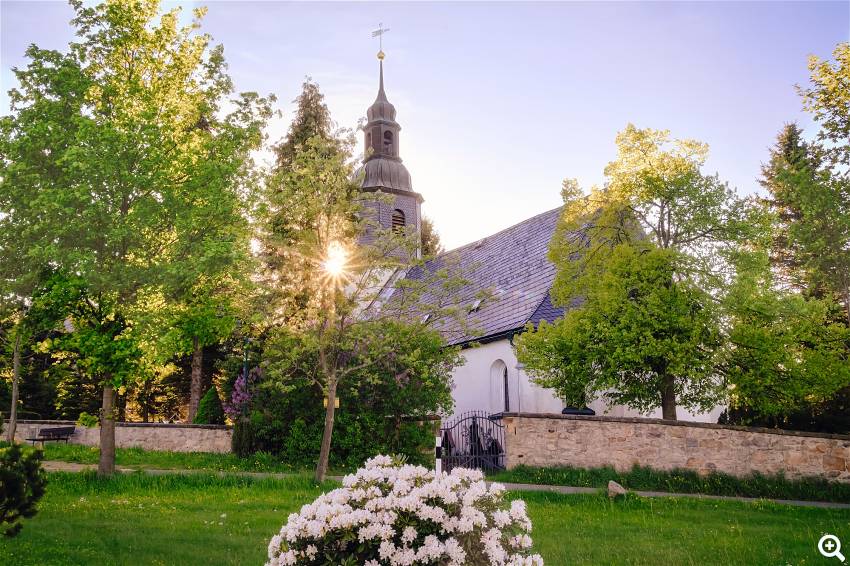 1593 ersetzte man die Holzkirche durch das heutige steinerne Gotteshaus. Der Kirchturm wurde im 18. Jahrhundert angebaut. Auf Geheiß Carl Rudolf von Carlowitz, Churfürstlich-Sächsischer Oberforst- und Wildmeister, wurde 1681 das Innere der Kirche ausgemalt. Dabei lies sich der Oberforstmeister bildlich und buchstäblich am Kanzelaufgang verewigen.