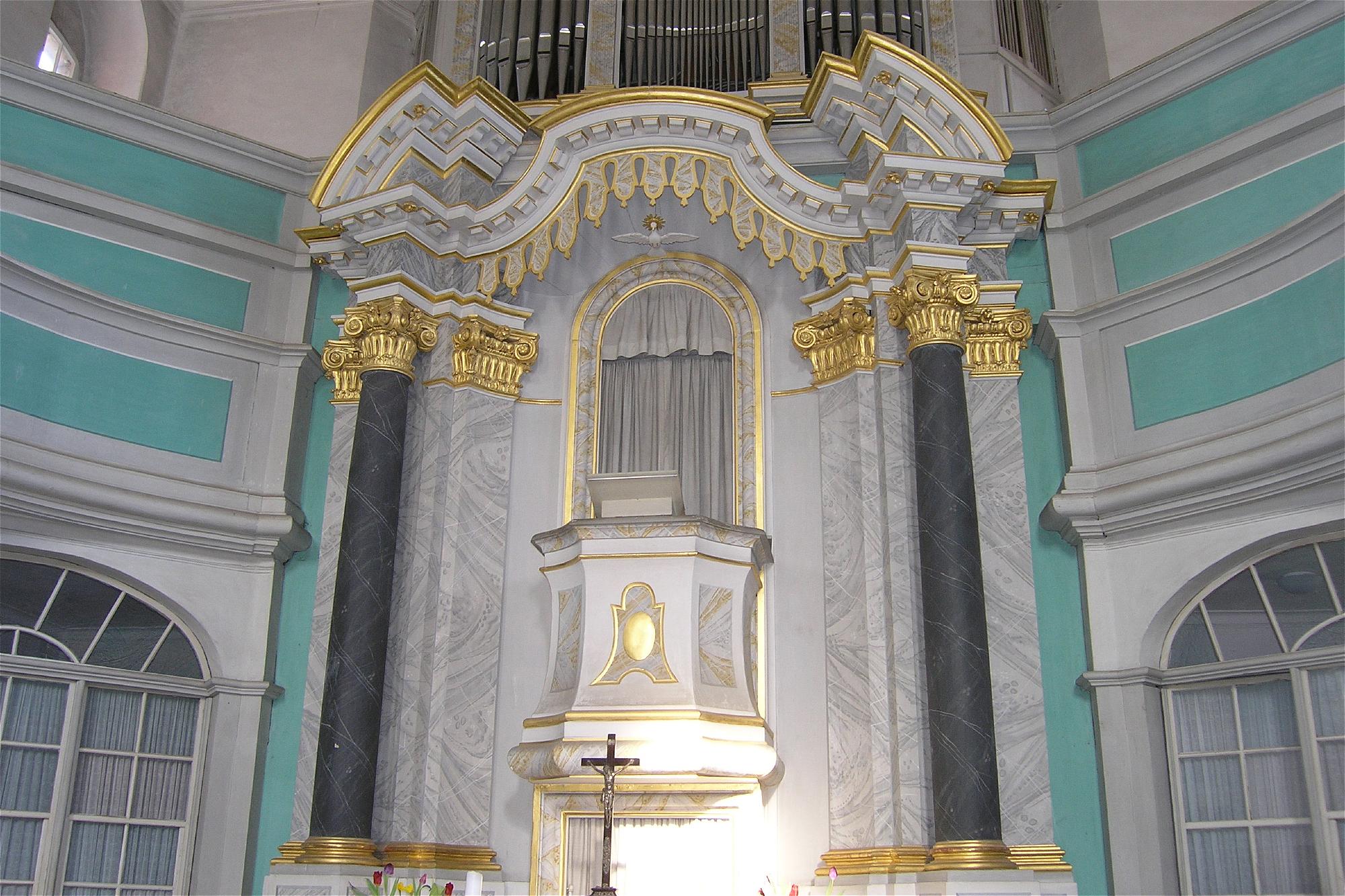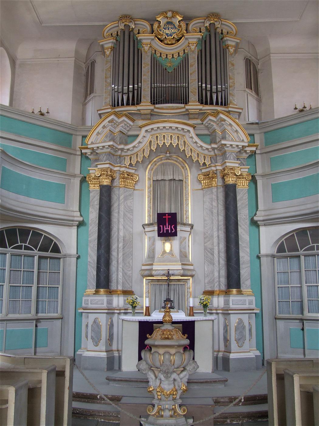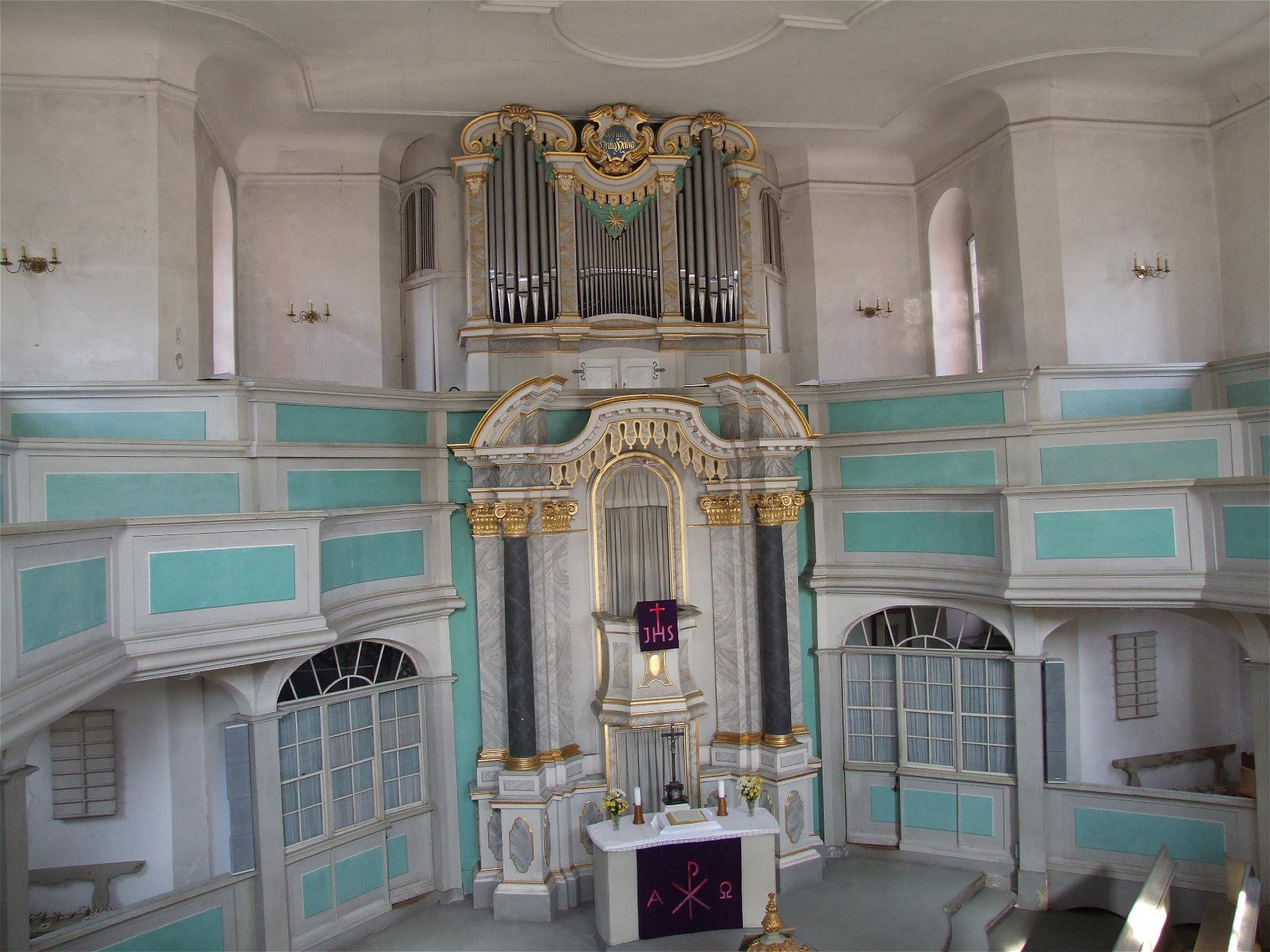 Sie ist ein Zentralbau - Altar und Kanzel sind weit in die Mitte der Kirche gerückt, die Gemeinde versammelt sich um Wort und Sakrament. Die Musik - in Gestalt der Orgel über Kanzel und Altar - komplettiert dieses Bild. Diese Anordnung entspricht dem Ideal eines evangelischen Kirchbaus, das sich so nur in sehr hohen Kirchen umsetzen lässt. Man kann dies in der großen Schwester unserer Kirche - der Dresdner Frauenkirche - sehen. So bringt die Schmiedeberger Kirche die Einheit von Wort, Sakrament und Musik besonders deutlich zur Geltung.
