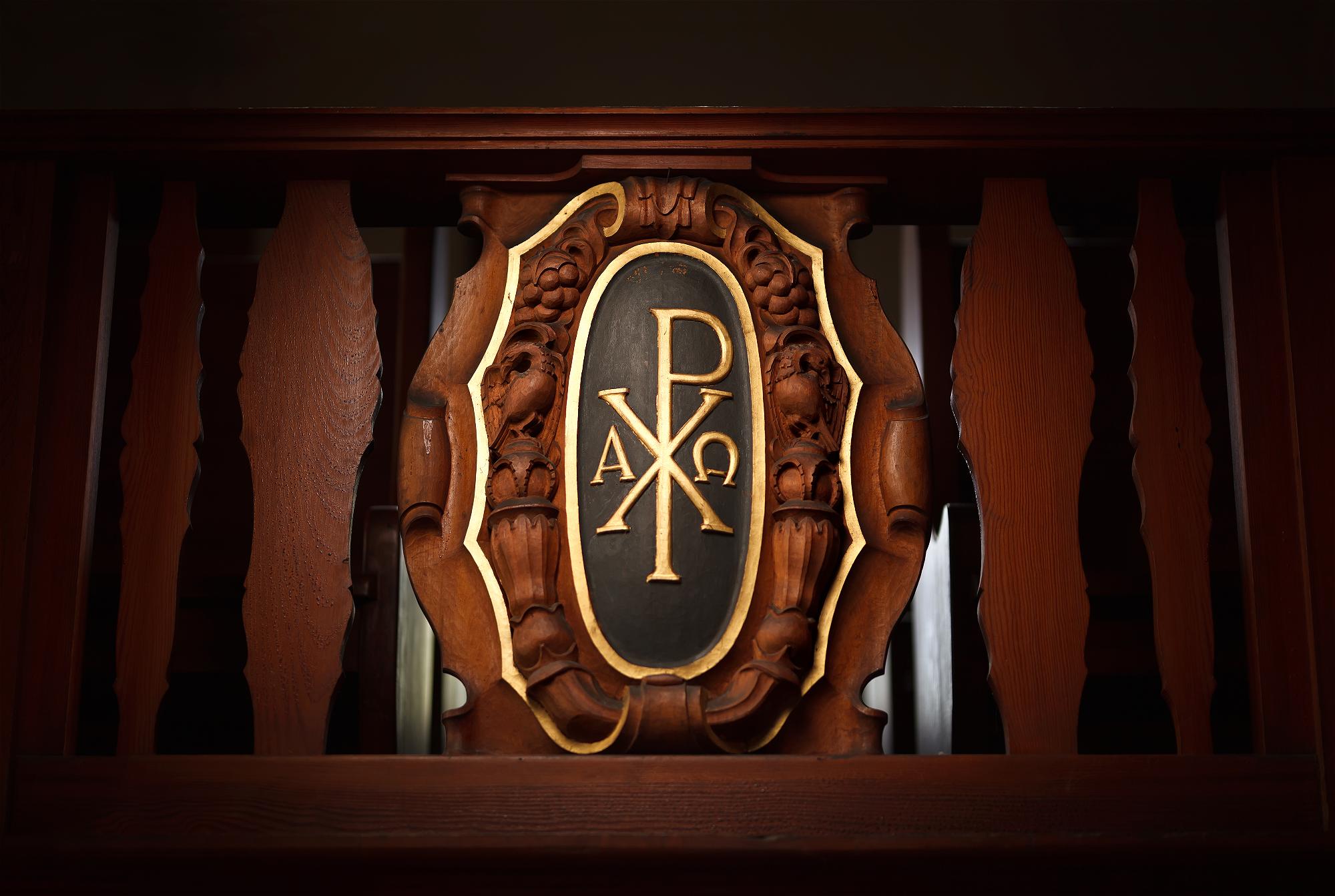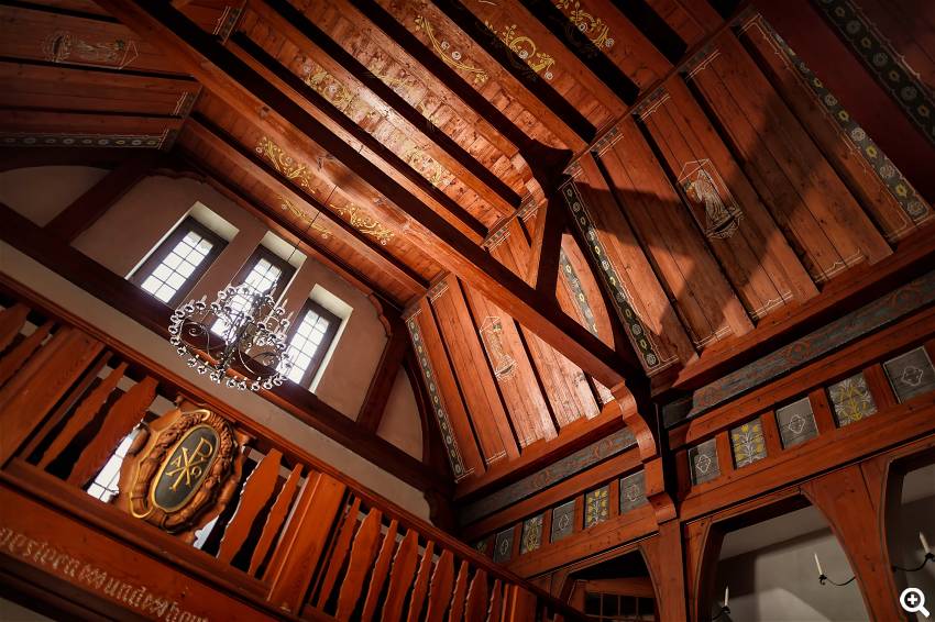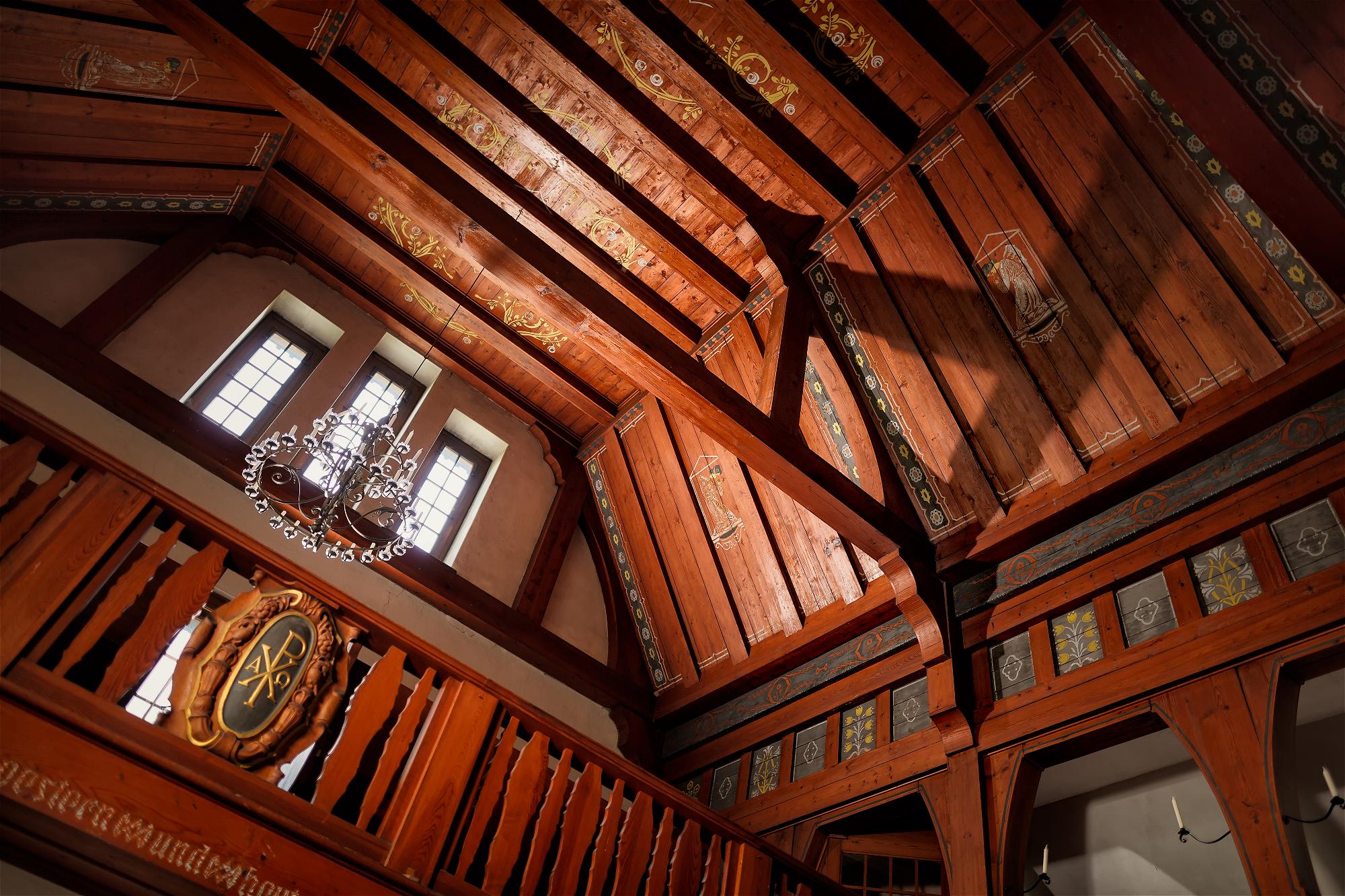 Empore, Decke sowie die Kanzel sind in braunem Holzwerk ausgeführt.