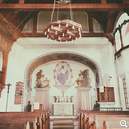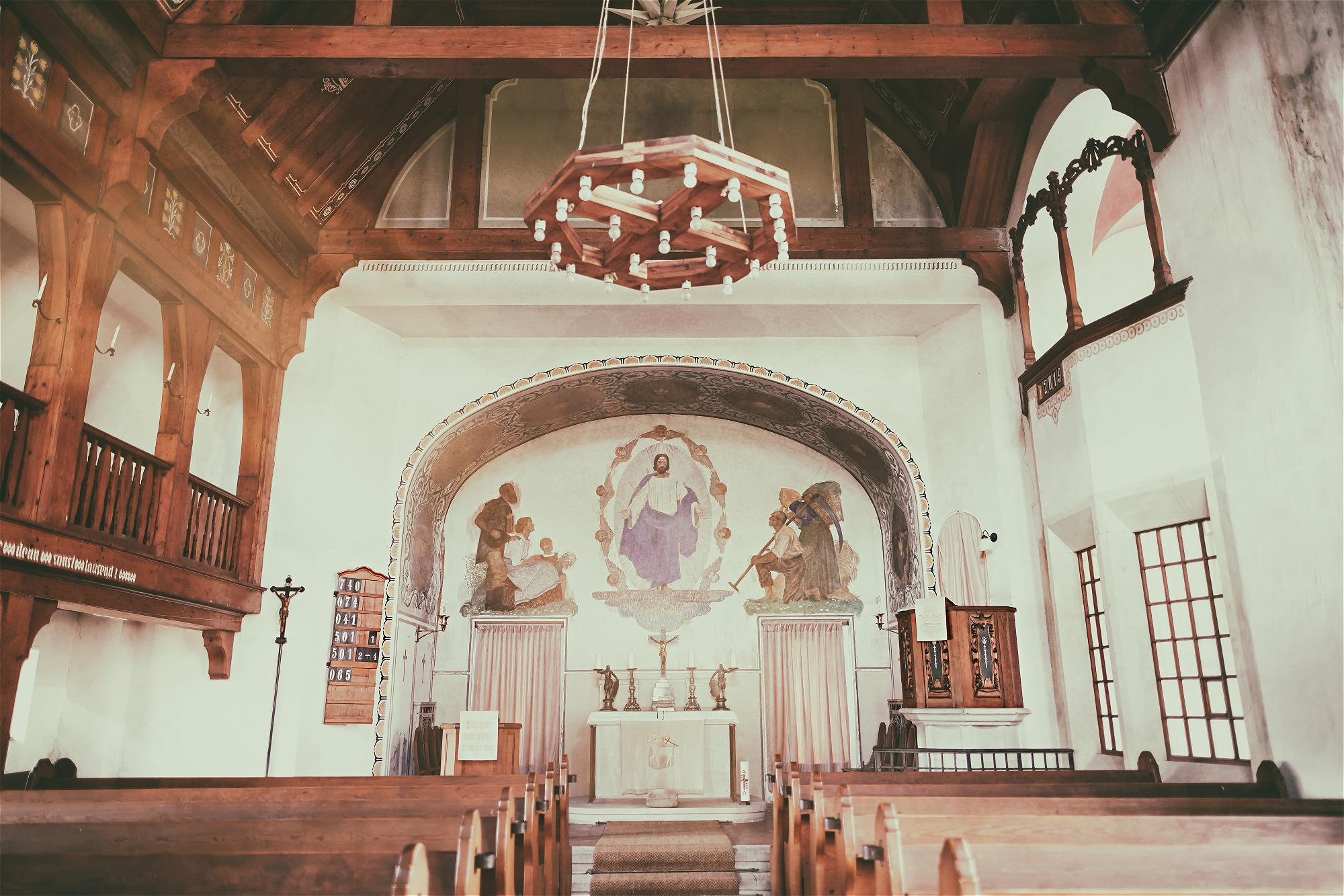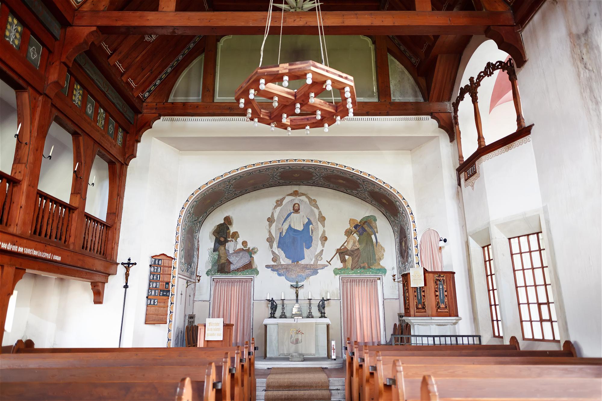 Die Orgel befindet sich im ersten Geschoss des mächtigen Turmes. Das Altarbild – auf Leinwand gemalt – ist an der Rückwand des Altarraumes angebracht. Es stellt je eine einheimische Bergmanns- und Bauernfamilie dar, welche den auferstandenen Christus anbeten.