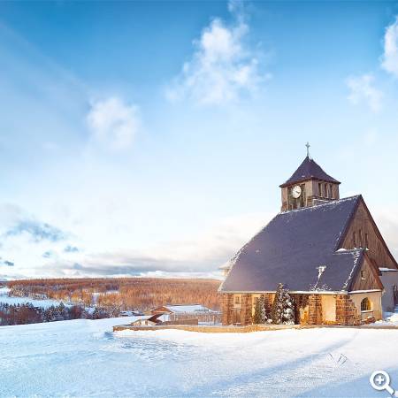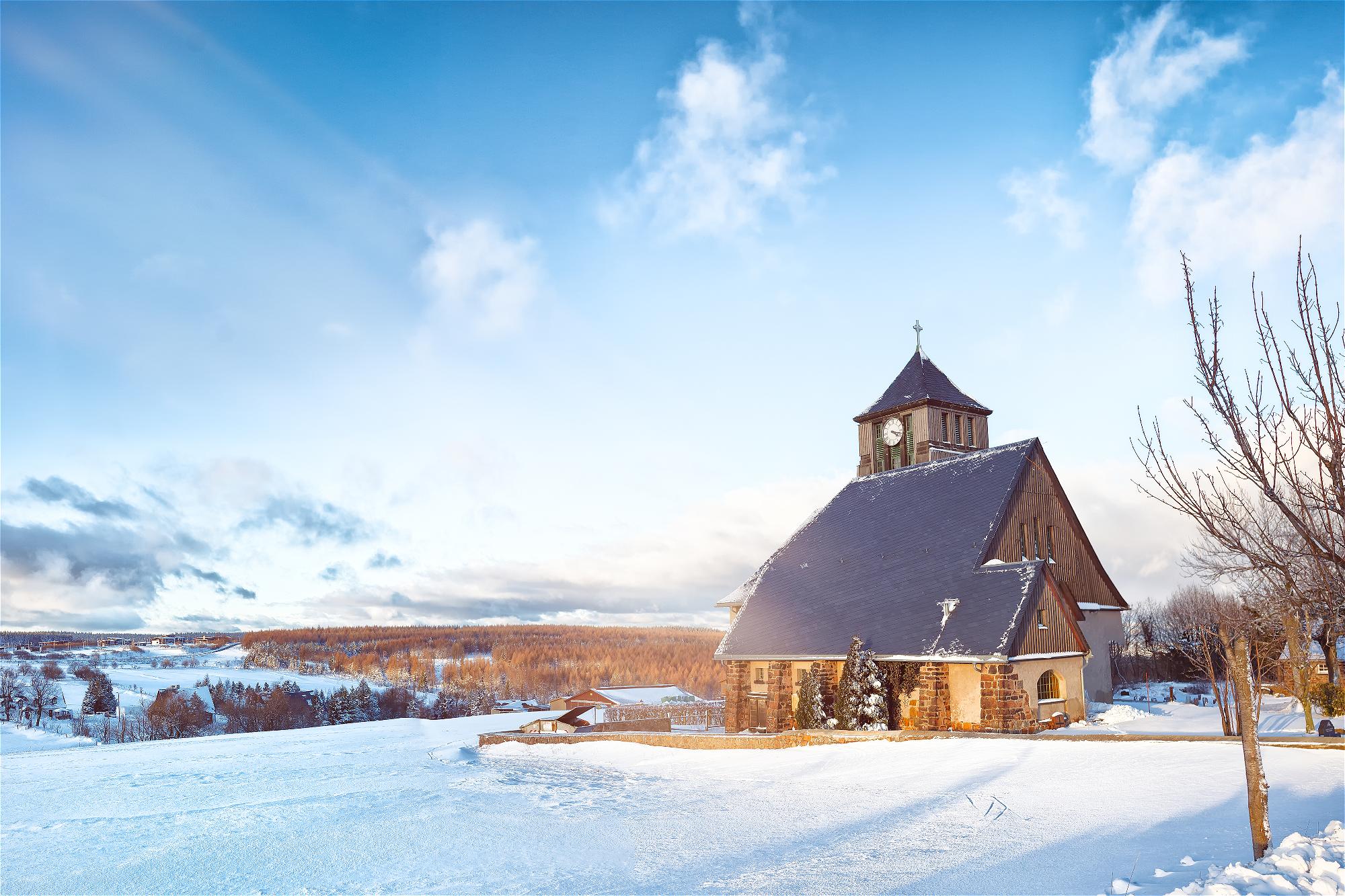 Die Ev.- Luth. Kirche zu Zinnwald-Georgenfeld wurde 1908/1909 nach Plänen der Dresdner Architekten Lossow und Kühne errichtet und trägt der hiesigen klimatischen Lage Rechnung.